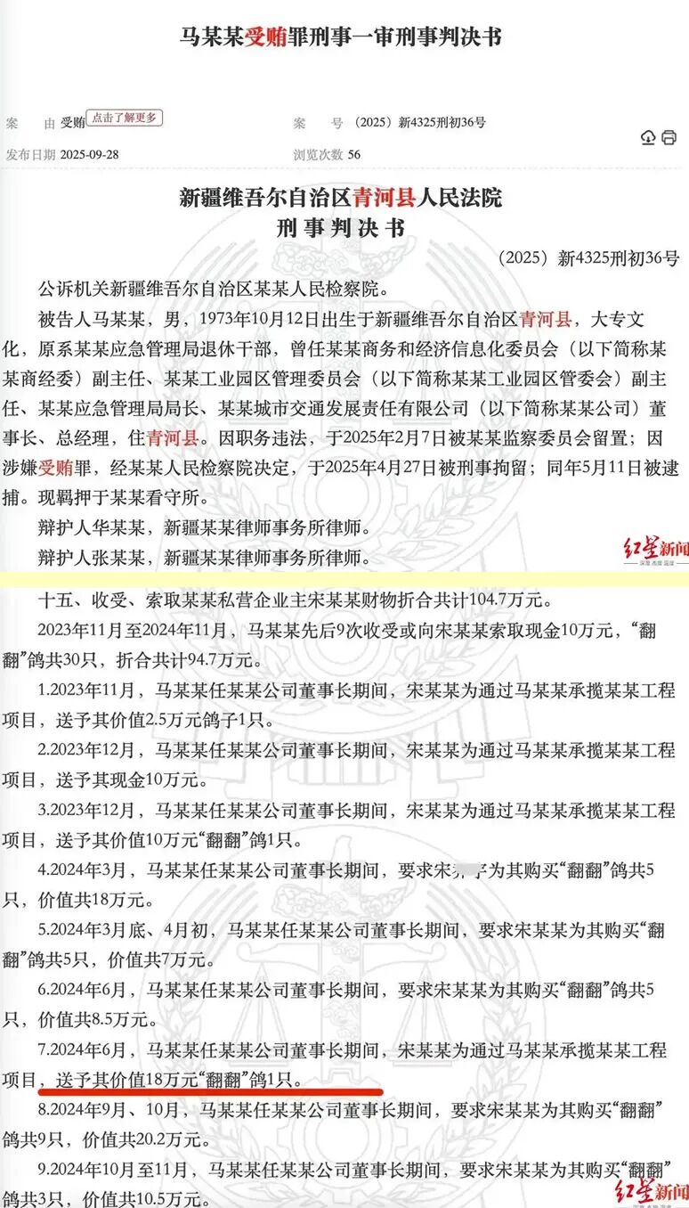 最初的贿赂,或许仍是传统的烟酒金钱。但人的欲望一旦决堤,便会寻找更刺激的宣泄口。2021年4月,时任应急管理局局长的马某某,在一次“偶然”的机会中,向一位矿产资源勘查开发公司的副总经理周某某,透露了自己对“翻翻鸽”的喜爱。很快,一只价值1.4万元的“翻翻鸽”便成了他的囊中之物。