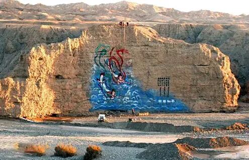 党河绝壁的巨幅自然岩体壁画《飞天》