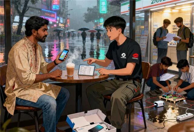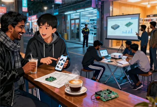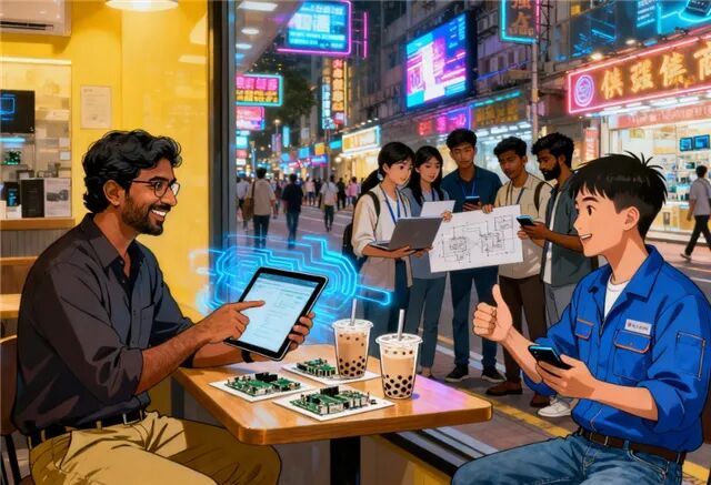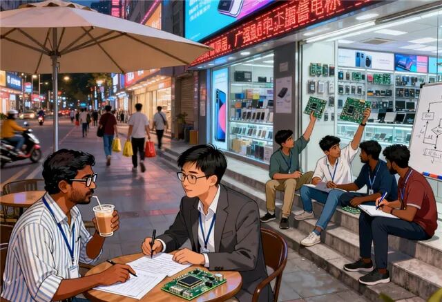 傍晚时分,华强北的街头更加热闹了。印度裔商人与中国供应商在咖啡馆里边喝奶茶边谈生意;不远处,一群中国和印度的年轻人正在讨论新启动的项目。