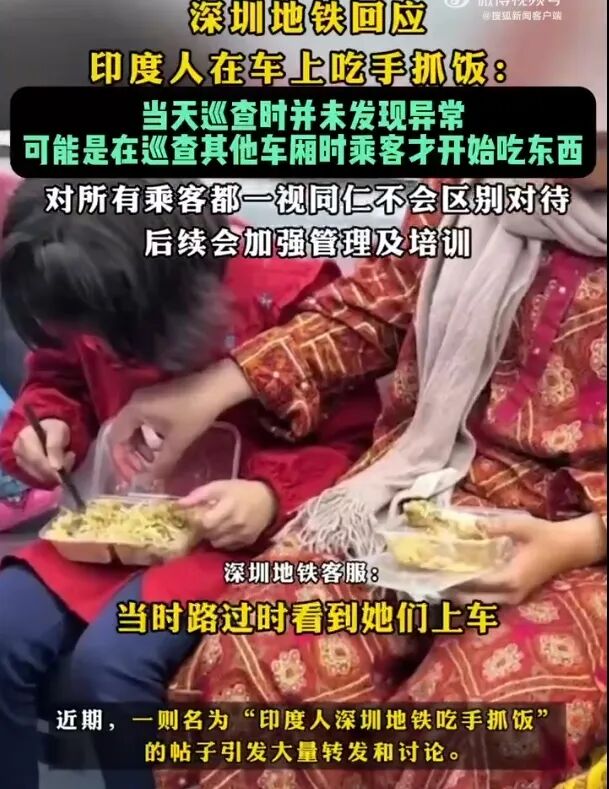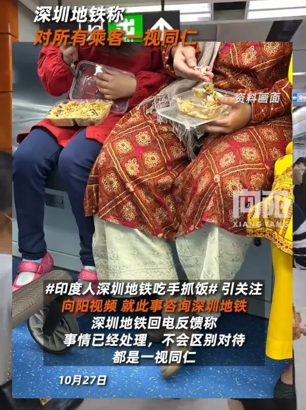 近日,一则“印度人在深圳地铁吃手抓饭”的视频引发热议。视频中,印度乘客在地铁三号线用手抓咖喱饭,油渍甚至蹭到了衣服上。
