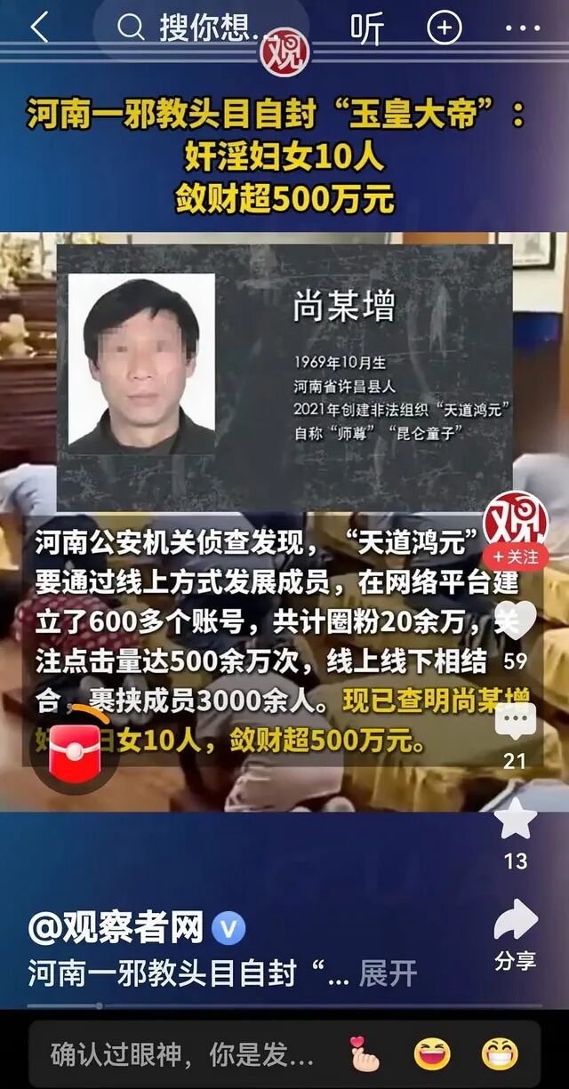除了敛财,尚某增还以“皇帝转世”“前世姻缘”“消除负能量、负磁场”为借口,奸淫多名女性。一名受害者自述,尚某增声称唯有与他发生关系、注入他所谓的“能量”,才能完成“清理”,否则不仅自身运势会越来越差,还会连累家人。