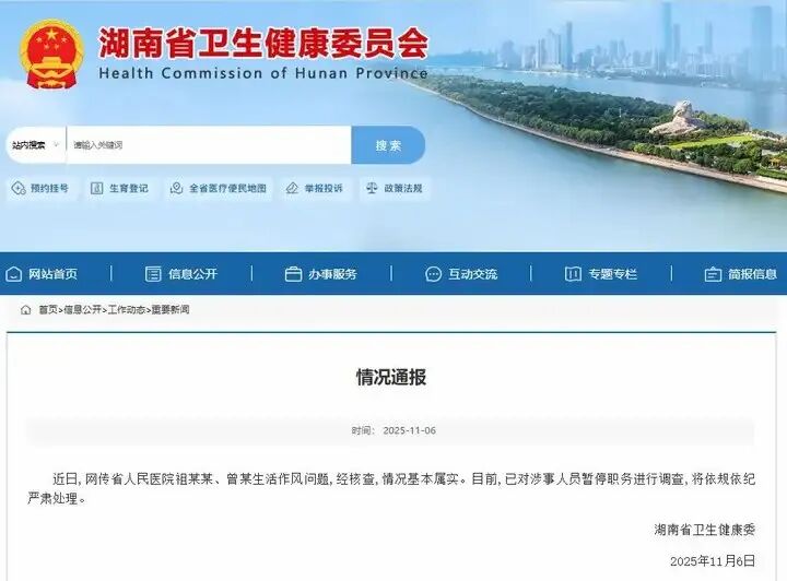 11 月 6 日,湖南省卫健委的通报如同惊雷炸响 —— 省人民医院副院长祖雄兵、眼科副主任曾琦的生活作风问题“情况基本属实”,两人已被暂停职务接受调查。这对顶着医学界 “顶流” 光环的搭档,瞬间从云端跌落泥潭。