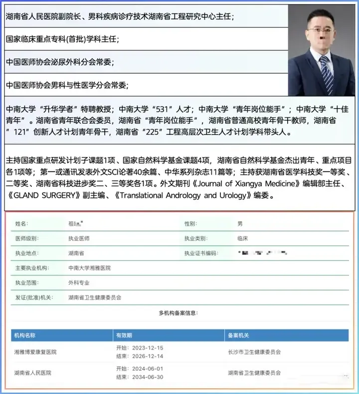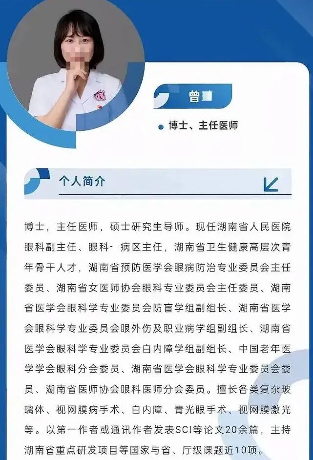 翻开两人的履历,堪称医疗界的 “神仙配置”:祖雄兵是主任医师、教授、博导,手握国家自然科学基金项目,发表 SCI 论文 47 篇,斩获 7 项省级科技奖励,还是湖南省 “121 创新人才培养工程” 骨干,从湘雅医院泌尿外科主任跳槽至省人民医院副院长,妥妥的行业领军者;曾琦作为博士、主任医师,擅长复杂玻璃体视网膜手术,以第一作者身份发表 20 余篇核心期刊论文,身兼眼科副主任与病区主任,是眼科领域的中坚力量。