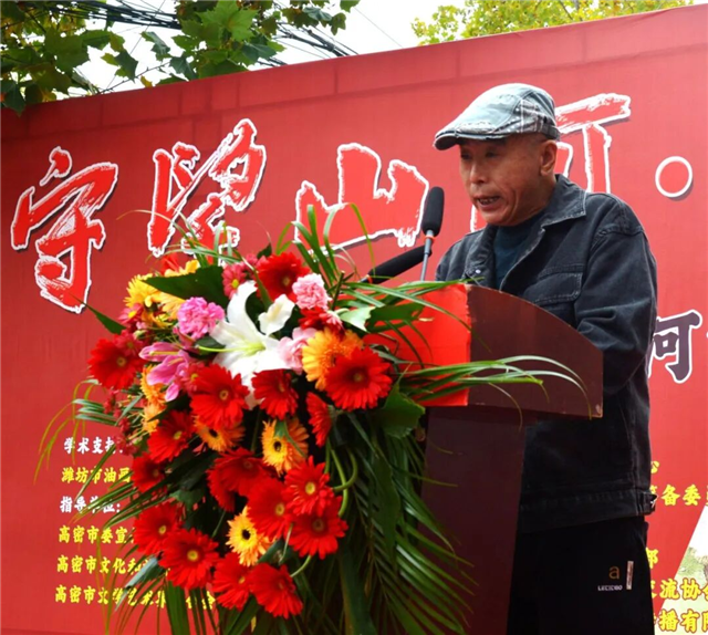 图为2025年11月9日,潍坊市美术家协会副主席李国强在“守望山河”张守河油画作品展开幕式上致辞。