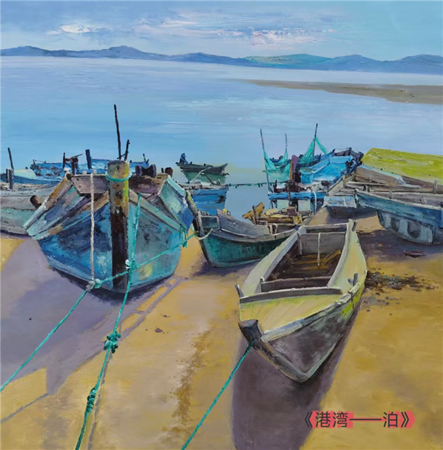我看到张守河创作的《港湾——泊》这幅油画作品,是他在荣成朝阳刚大桥底的一个渔民码头的场景,五月休渔期的码头,看不到忙碌的人们,只剩下静静停泊的渔船在海边。渔船岁月斑驳的痕迹述说着曾经满载而归的辉煌。