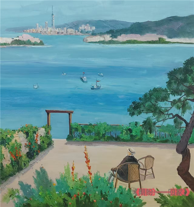 在山东高密北斗教育艺术中心三楼的展厅里,共展出张守河创作的油画作品共60余幅。我看到张守河创作的《期盼——回家》这幅油画作品,碧海无垠,船影如星子散落。近处庭院繁花簇拥,一位老者静坐凝望——远方,台北101大厦刺破云雾,于山峦间勾勒出现代都市的轮廓,那是台湾的标志性印记,更是千万游子魂牵梦萦的故乡剪影。海水滔滔,从未隔断两岸同根的血脉。画中连绵的山峦、相拥的海湾,本就是中华大地的自然肌理;台北101的摩登线条与近处田园的烟火气遥相呼应,恰如历史与当下、传统与现代在华夏版图上的共生。老者的背影,何尝不是无数眷恋故土的同胞缩影?他们守望着海峡,把对团圆的渴望揉进每寸晨光暮色,任岁月在凝视中沉淀成厚重的乡愁。