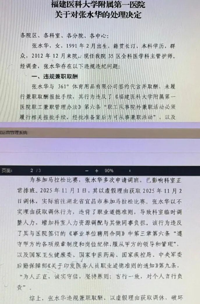 近日,福建医科大学附属第一医院的一份处理决定引发热议。该院工作人员张水华因违规与体育用品公司签约代言取酬,以及为参加马拉松比赛编造虚假理由调休,受到警告处分六个月、取消2025年评优资格的处理。
