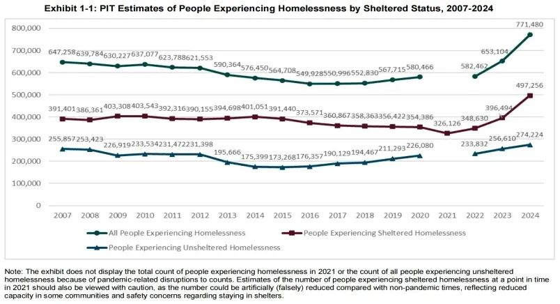 △ 2007-2024年美国无家可归者人数变化(图片来源:U.S. Department of Housing and Urban Development. (2024). The 2024 Annual Homelessness Assessment Report (AHAR) to Congress: Part 1: Point-in-Time Estimates of Homelessness.)