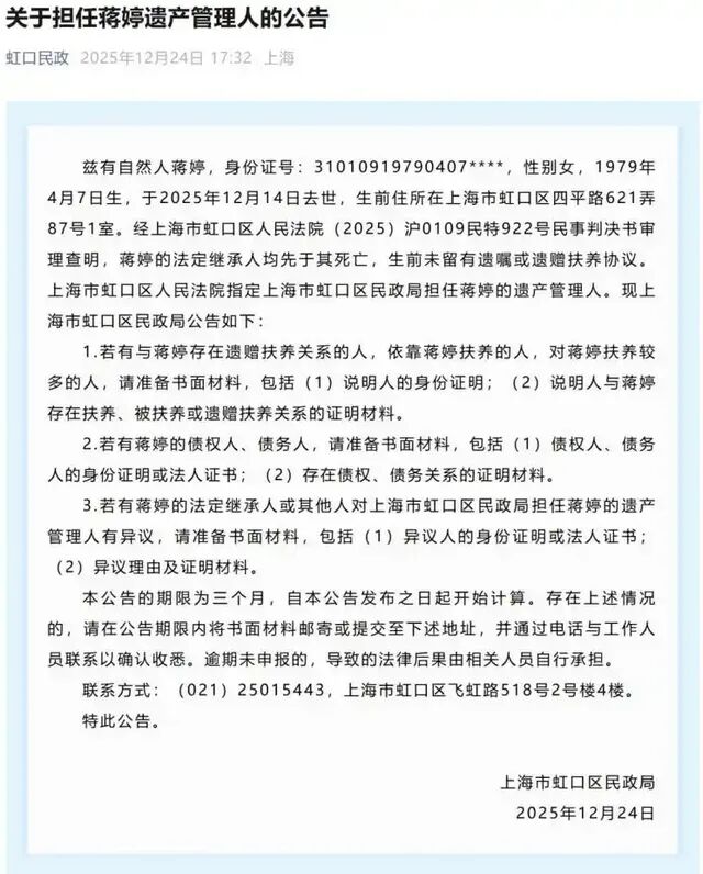 于是,法院指定虹口区民政局担任她的遗产管理人,处理她的身后事。公告希望找到“与蒋婷存在遗赠扶养关系的人,依靠蒋婷扶养的人,对蒋婷扶养较多的人”,以及她的债权人、债务人。