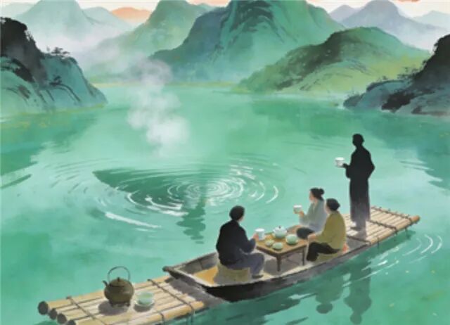 山、水、茶、人且荡且驻。波起濯足,轻雾萦衫,停杯可立筏头,人影风梳默无言,宽袖飘飘,衣摆翻飞,蛩鸣鸟啾闻物息,松风竹语目观鱼,看着眼前缓缓移动的倒影,仿佛已是在天一方幽人了。