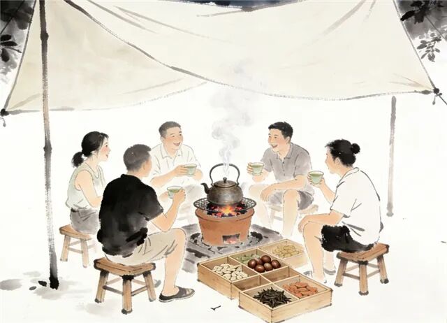 一个简易帆布屋架起来了,几把木凳围一泥炉,炉内栗炭火正旺,炉上铁壶内山泉水正哼唧着小夜曲,精致的杉木格匣分放着各类配茶的干点干品——几位散淡人正围炉而茗而喧哗。