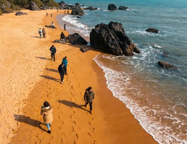 这里远离市区的喧闹,眼前一片巨大的海湾,伸向烟水迷朦的天边。近处是金黄的沙滩,点缀着千姿百态的礁石:或如群象歇憩,或如坡鹿远眺,或如骏马驰奔,或如猛虎长啸……这些礁石历经海浪千年万载的淘洗,从容淡定。
