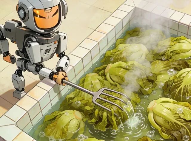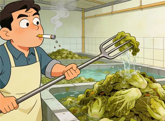 一个男人站在那里,手里拿着钢叉,翻动着池子里堆积如山的酸菜。他的嘴里叼着一支烟,烟灰不时飘落,他随口一吐,唾沫便融进了那池正在发酵的腌菜里。