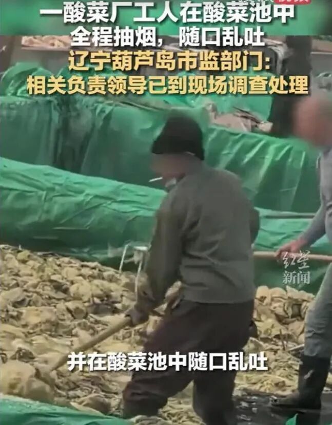 这让我想起了三年前的“土坑酸菜”——同样的场景,同样的随意。工人赤脚踩在酸菜上,烟头随手一丢,仿佛脚下的不是食物,而是一堆无所谓的杂草。