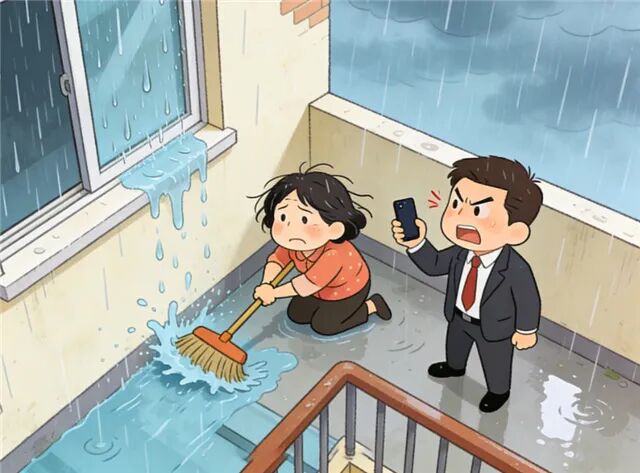 从门缝往外看,保洁大姐跪在四楼拐角,攥着扫把,死命把涌进楼道的雨水往外推。水裹着泥沙、烟头、不知谁扔的餐巾纸,从楼梯口一级一级滚下来。她来不及拦。一个穿白衬衫的男人站在二楼平台,举着手机,声音刺穿楼道: