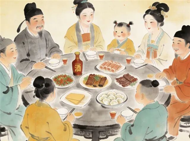 由此观之,宋代的年夜餐桌,虽无今日四海珍馐之丰,其内核却早已成熟。那是一场以团圆为祈愿的隆重仪式,每一道菜、每一盏酒,都被赋予了超乎本身的深意:椒柏酒藏着“诗酒趁年华”的豁达,腊味承载着“无腊不成年”的执念,春饼寓意“包纳万福”的包容,馄饨象征“一元复始”的新生,这哪里是满足口腹?分明是以“吃”为媒介,与祖先、自然、时间、命运进行着一场温柔而庄重的交流。食物是味觉的,也是文化的;是物质的,更是精神的。