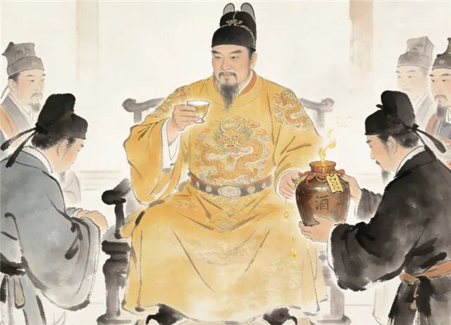 一日,朱元璋下旨宴请文武群臣,为皇后祝寿。想起家乡送来的老酒,便命人取来,拆开蜡封,顿时满室弥香。倾入瓷碗之中,但见酒体丰满,呈现淡豆绿色,饮上一口,豆香清雅,入口绵柔醇冽,回味绵长。文武群臣更是齐赞好酒,当下龙颜大悦。命人召来盱眙县令,询问此酒叫什么名字。盱眙县令被召见驾,一时紧张,忘了“醽醁”两字的读音。又怕皇上怪罪,灵机一动谎称此酒名为“绿豆烧”,朱皇帝见这个“酒中奇葩”的名字有点粗俗,心想既然是用家乡明光的绿豆酿造出的琼浆玉液,以后就叫“明绿液”吧。因为酒名为朱皇帝金口所赐,所以“明绿液”又称为“明光御酒”。