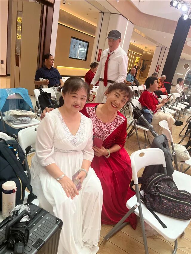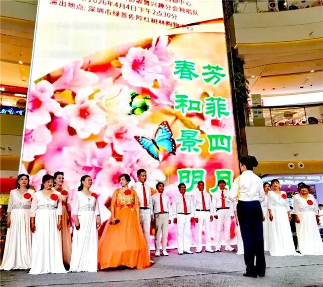 四月的风偷吻过木棉的唇,把甜香搓成丝线,缠在绿景佐邻的玻璃幕墙上,每块玻璃都洇着半透明的暖。4日午后的阳光是最精巧的剪子,把廊栏的影子铰成碎金,撒在五层回廊的人群里——那里早挤成了一片期待的海。市老科协萱草花合唱队的压轴戏,是熟得像四月木棉一样的《我爱你中国》。在队长唐明珍带领下,今年这是第四回,在这廊下,让歌声顺着风,往城市的褶皱里钻。