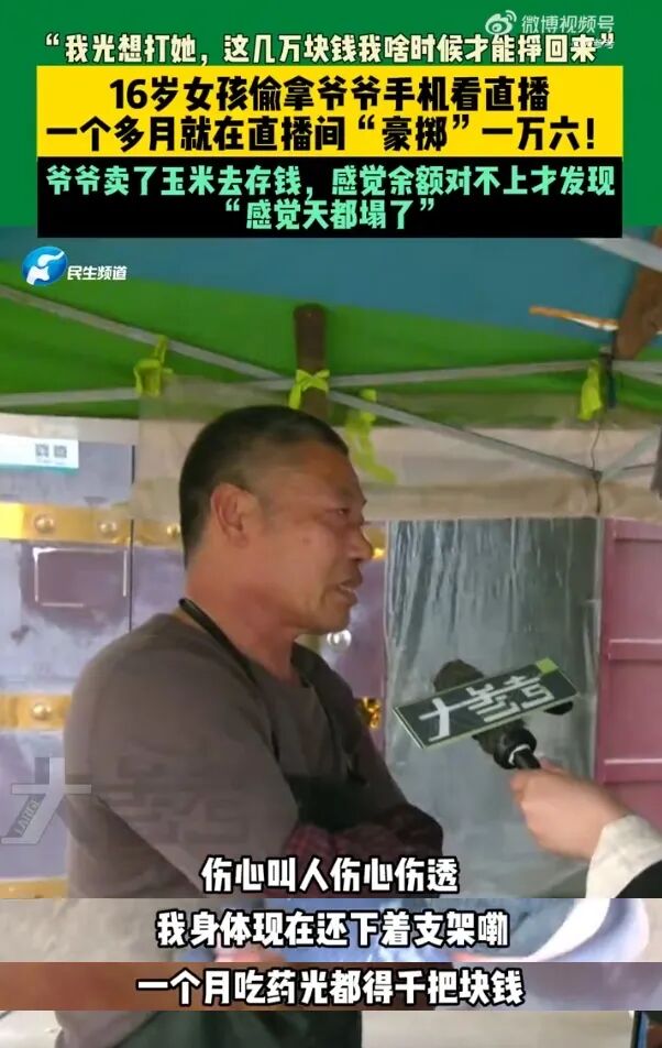 爷爷说,自己身体不好,每个月吃药都要花掉千把块钱。那天他去银行存钱,发现余额对不上,查了记录才知道,钱被孙女“花”了。不是买书,不是交学费,而是换成了直播间里一声声“谢谢大哥”“感谢老铁”的虚拟回应。