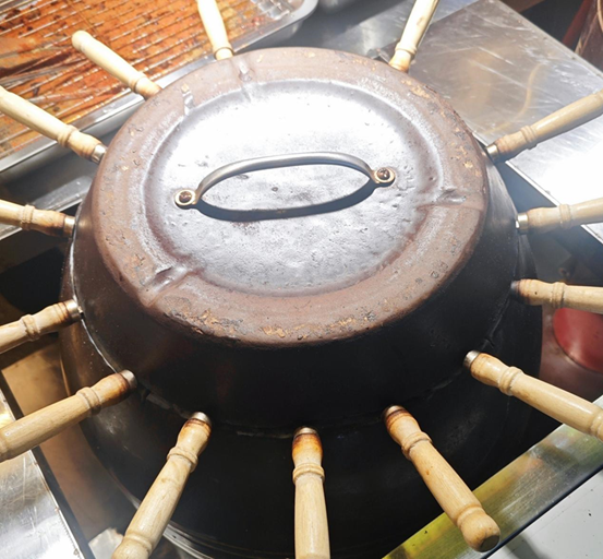 熏制开始,没有猛火,只有瓦罐持续释放、温和而持久的暗热。那热量无声地包裹着食物,透过陶瓷的缝隙,丝丝缕缕地渗透进去。老板娘并不着急,只是偶尔掀开盖子一角,迅速用刷子蘸上深褐色的酱汁,淋刷在鸡翅表面。每一次掀盖,都有一股更浓郁的酱料甜香涌出,短暂地压过街头的其他味道。就在这缓慢的熏烤中,鸡皮逐渐收紧,染上焦糖的色泽,油脂被逼出,在表面形成油光。那特制的小笼,将底下的暗火和果木烟转化成鸡翅的独特风味:深沉的甜,含蓄的辣,以及贯穿始终、无法复制的果木熏香。甜辣的香气,就在这慢火的熬炖与烟气的浸润里,一点点变得浓郁而扎实。
