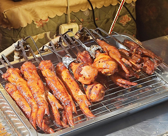 穿行在这片小吃街,一家熏制摊位的油亮鸡翅,瞬间锁住了我的目光。焦糖色的脆壳,紧紧包裹着鼓胀的肉质,细密的香料颗粒在油光下清晰可见。邵东人总会选用本地散养土鸡的鸡翅,先以八角、桂皮、草果等十余种香料腌制整夜,让调料的辛香渗透每一丝肌理。次日清晨,摊主会在特制陶炉中生起果木火,将鸡翅悬挂于松木与荔枝木的烟火上,借由文火慢熏。果木的甜香与香料的醇厚在热力中交融,在鸡翅表面形成琥珀色的糖衣,而肉质则在低温熏制里,保持着鲜嫩多汁的口感。